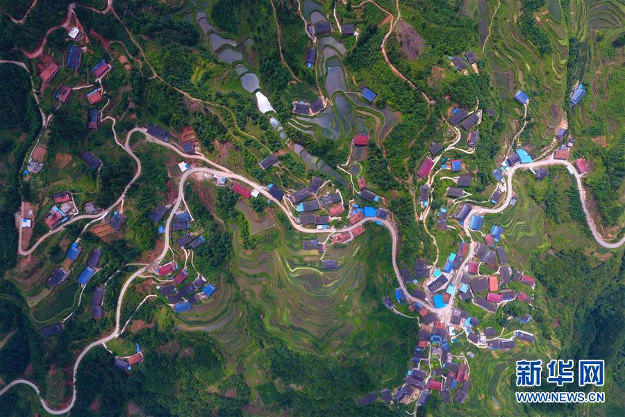 在融水苗族自治縣桿洞鄉(xiāng)黨鳩村下黨鳩屯,道路已經(jīng)修到家家戶戶門前(6月21日無人機(jī)拍攝)。新華社記者 黃孝邦 攝