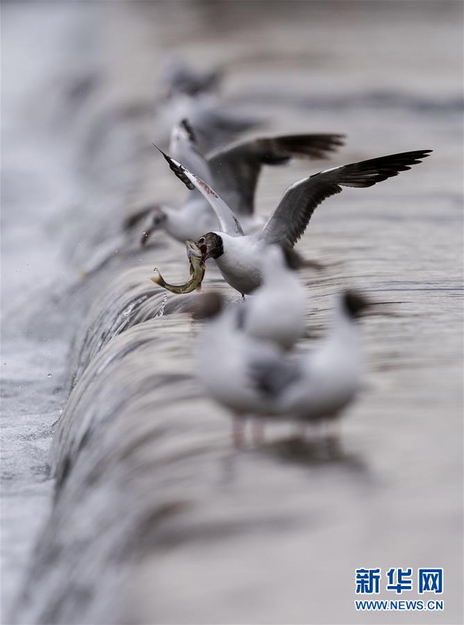 7月6日,在青海省剛察縣沙柳河里,幾只棕頭鷗在捕捉躍起的湟魚。  新華社記者 費茂華攝