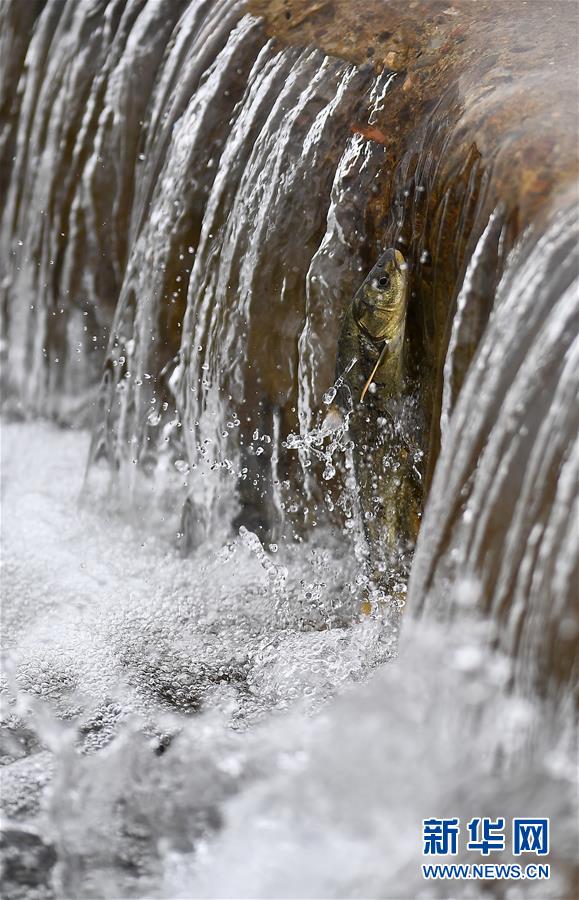 7月6日,在青海省剛察縣沙柳河里,一只湟魚躍起向上洄游。  新華社記者 劉金海攝