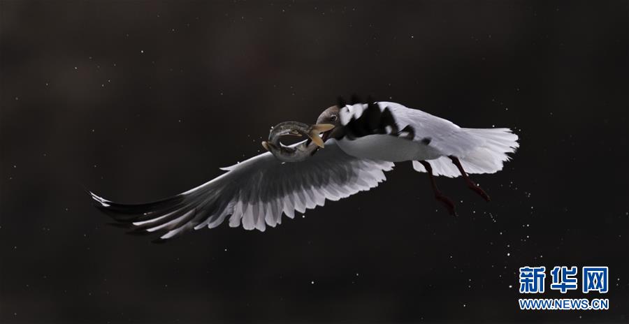 7月6日,在青海省剛察縣沙柳河里,一只棕頭鷗捕捉到一只躍起的湟魚。  新華社記者 劉金海攝
