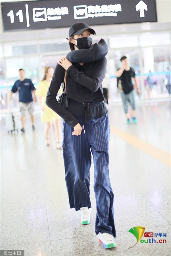 關(guān)曉彤淡定抱臂行走 脖子上掛U型枕毫無偶像包袱