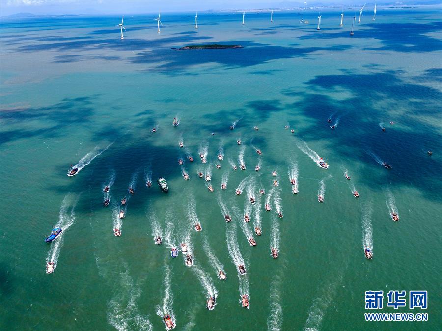 8月3日,在首屆福清開漁節(jié)上,漁船駛向大海(無(wú)人機(jī)拍攝)。新華社記者姜克紅攝