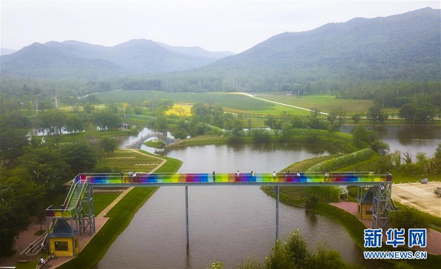 8月8日,游客在伊春市九峰山養(yǎng)心谷景區(qū)玻璃棧橋上行走(無人機拍攝)。 時值八月,黑龍江省伊春市林區(qū)空氣清新,涼爽宜人,吸引眾多游客。 新華社記者李曉果攝