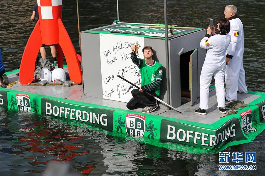 當(dāng)日,一年一度的水上狂歡活動(dòng)“浴缸劃船節(jié)”在比利時(shí)迪南舉行。該活動(dòng)要求參賽者制造的船上至少帶有一個(gè)浴缸,參賽者需完成一千米的水上巡游,最后根據(jù)設(shè)計(jì)創(chuàng)意及現(xiàn)場(chǎng)表演而非行進(jìn)速度評(píng)選出優(yōu)勝者?!霸「讋澊?jié)”始于1982年,今年的主題是"我們?cè)谠虑蚵?quot;。 新華社記者 張鋮 攝