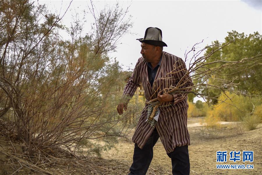 在羅布人村寨,阿木東·艾不東在準備用于制作羅布烤魚的紅柳(2018年10月16日攝)。新華社記者 趙戈 攝