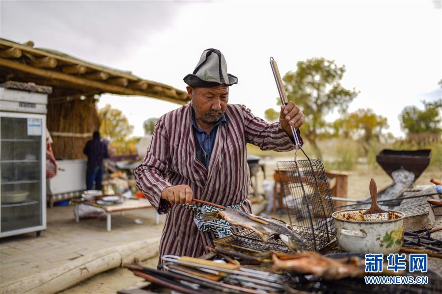 羅布人村寨位于新疆巴音郭楞蒙古自治州尉犁縣,塔里木河從這里流過,沙漠、胡楊、湖泊的奇妙組合吸引了不少游客。生活在這里的羅布人阿木東·艾不東更成為大家關(guān)注的焦點。 阿木東·艾不東61歲,聲音洪亮,面色紅潤,平時喜歡穿著羅布麻紡織而成的對襟長袍和羊毛氈制成的船形帽子,這是羅布人的傳統(tǒng)裝扮。 如今,許多羅布人不再以打魚為生,他們有的放牧,有的種植,有的開設(shè)店鋪……像阿木東一樣在沙漠中漁獵的羅布人已經(jīng)很少了。 制作羅布人傳統(tǒng)美食——紅柳烤魚是阿木東的拿手絕活。一根紅柳,穿起一條野魚,起一堆炭火,撒少許鹽巴,就可以靜待皮焦肉嫩的紅柳烤魚了。除了傳統(tǒng)口味外,阿木東對羅布烤魚進行了改良。“我秘制了一種烤魚醬,里面除了辣椒、鹽巴、孜然,還有其他佐料。”當(dāng)問起具體是哪些配方時,阿木東笑著說:“還有就是塔里木河的味道!” 阿木東是一個閑不住的人。旅游旺季過后,他會制作卡盆(胡楊制作的獨木舟)模型、胡楊筆筒等,等旺季來臨再把這些小物件賣出去。 兩千年前,塔里木河與孔雀河載著天山、昆侖山的雪水,把羅布泊充盈得煙波浩渺。羅布人靠羅布泊水域和周圍的濕地及原始胡楊林繁衍生息。后來,塔里木河下游河床被風(fēng)沙淤塞,干旱斷絕了綠色。2001年,塔里木河流域近期綜合治理項目啟動。隨著下游河道兩岸地下水位的抬升,相當(dāng)數(shù)量的胡楊從死亡的邊緣“醒來”,重新護佑這里的綠洲與百姓。 近幾年,阿木東生活的地方基礎(chǔ)設(shè)施大為改善,柏油馬路修到了塔里木河畔。前來領(lǐng)略大漠胡楊的游客也越來越多。據(jù)了解,截至7月底,尉犁縣今年已接待游客78萬人次,旅游總收入超過1.1億元,同比分別增長63.14%和119.42%。 新華社記者 趙戈 攝