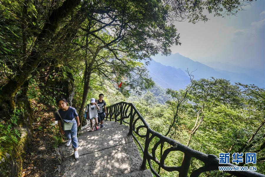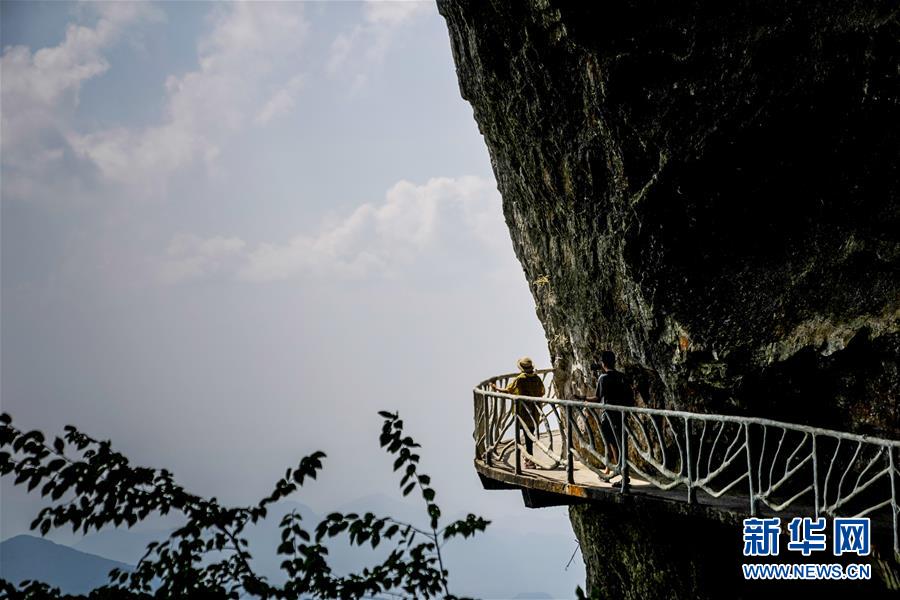 游客在重慶金佛山風(fēng)景區(qū)內(nèi)的絕壁棧道上游覽體驗(8月20日攝)。 新華社記者 劉潺 攝