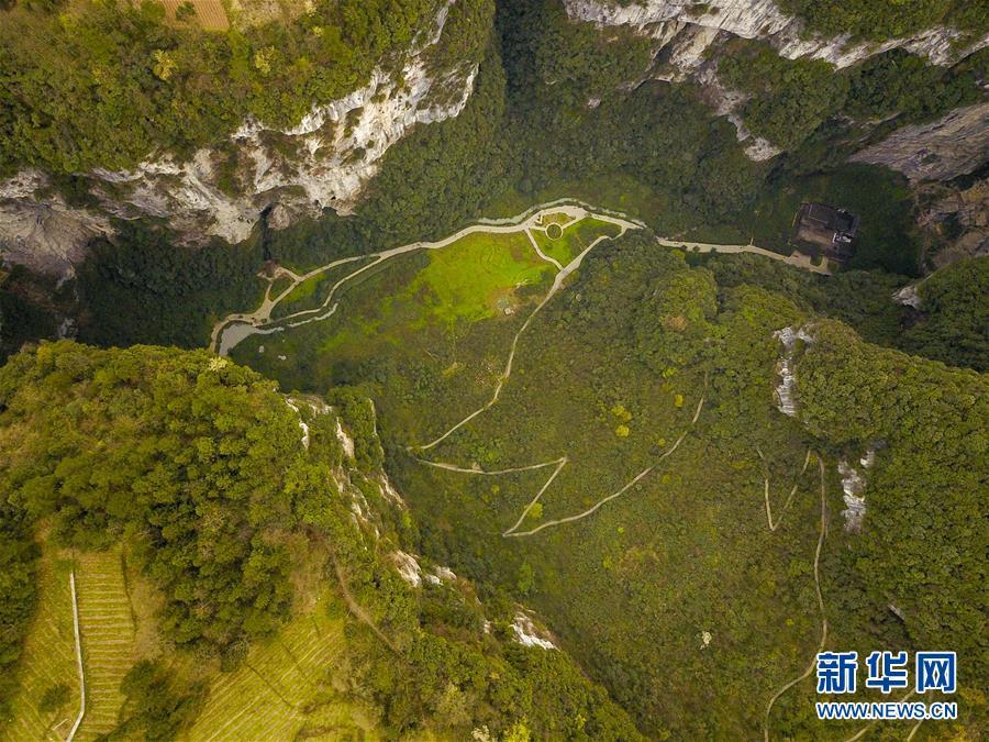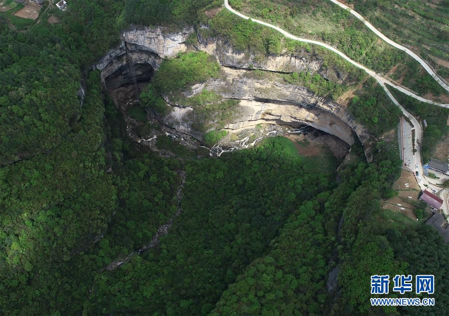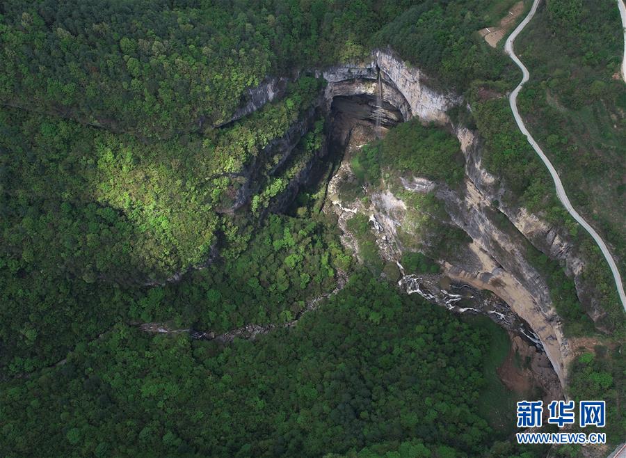 4月22日無人機拍攝的地洞河天坑。 新華社記者 張博文 攝