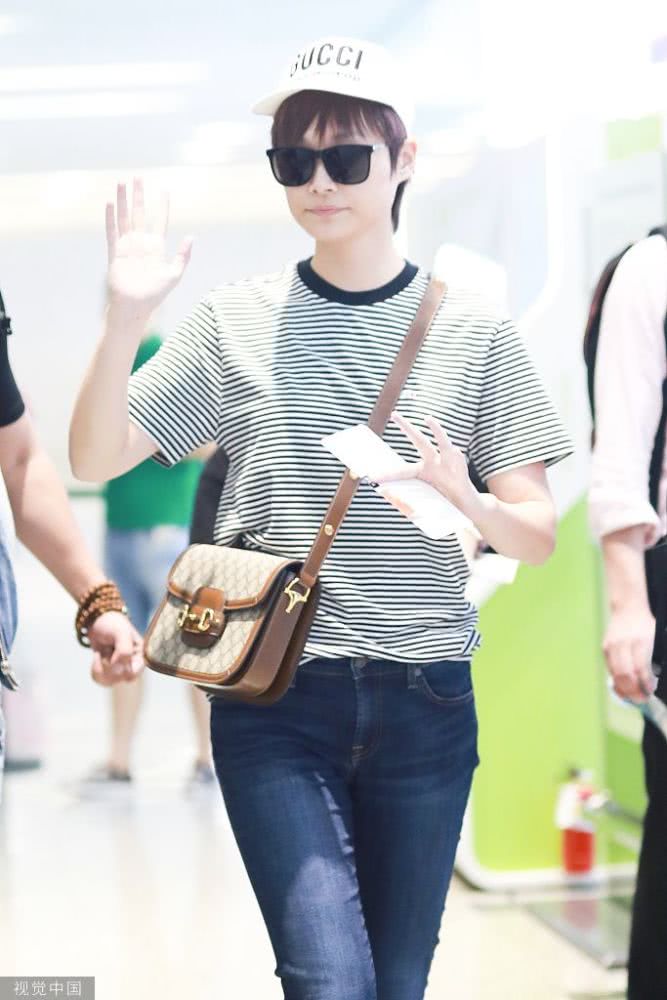她身穿條紋T恤搭配牛仔褲,青春活力。頭戴棒球帽,黑超遮面,又不失酷感。