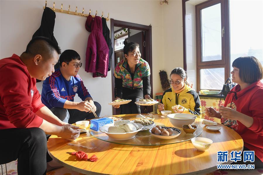 在舒蘭市二合屯,吳慶榮(右三)在自家的農(nóng)家樂(lè)內(nèi)為游客上菜(1月26日攝)。新華社記者許暢攝