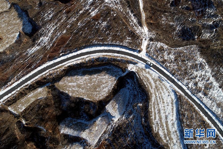 車輛行駛在王莊溝村通往大有鄉(xiāng)的道路上(2月16日無(wú)人機(jī)拍攝)。 新華社記者 詹彥 攝