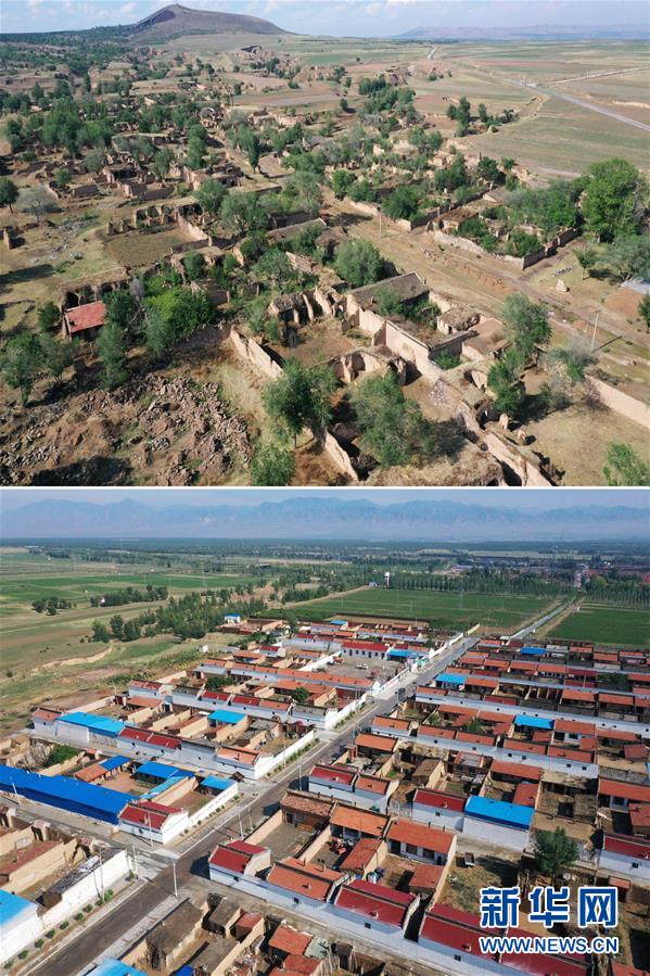 拼版照片:上圖為東坪村舊村村貌;下圖為東坪村新村村貌(6月13日無(wú)人機(jī)拍攝)。