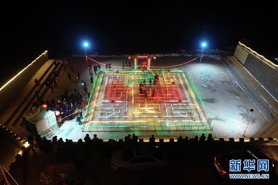 在武鄉(xiāng)縣大有鄉(xiāng)王莊溝村廣場(chǎng)上,村民們?cè)诰徘S河燈陣中觀燈(2月16日無(wú)人機(jī)拍攝)。 新華社記者 詹彥 攝