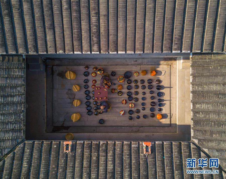 在福建省永春縣仙夾鎮(zhèn)龍水村,村民在老宅制作當(dāng)?shù)靥厣峄@(1月28日無(wú)人機(jī)拍攝)。 新華社記者 宋為偉 攝