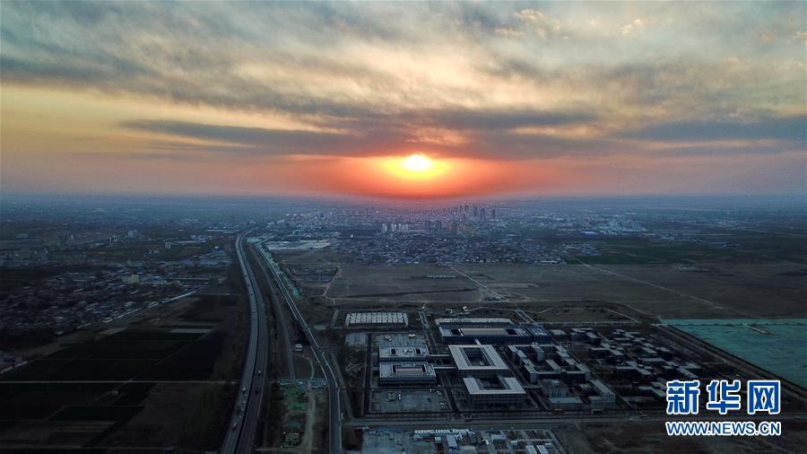 3月31日無人機拍攝的雄安新區(qū)市民服務(wù)中心(前)遠處為容城縣城區(qū)。新華社記者牟宇攝