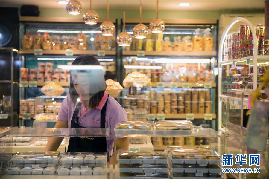 9月1日,店員在泰國(guó)曼谷著名的“九姐妹甜點(diǎn)”店整理貨架。