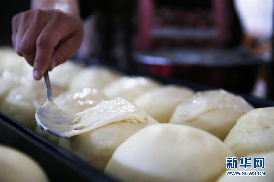 8月29日,付艷梅為發(fā)酵好的面包團(tuán)抹奶酪。新華社記者淡航攝