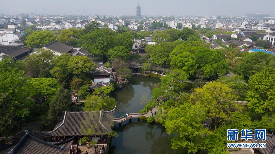 4月17日無(wú)人機(jī)拍攝的蘇州拙政園。 新華社記者李響攝
