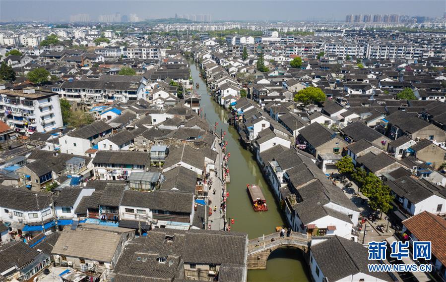 圖為4月18日無人機拍攝的蘇州山塘街及城景。 新華社記者 李響 攝