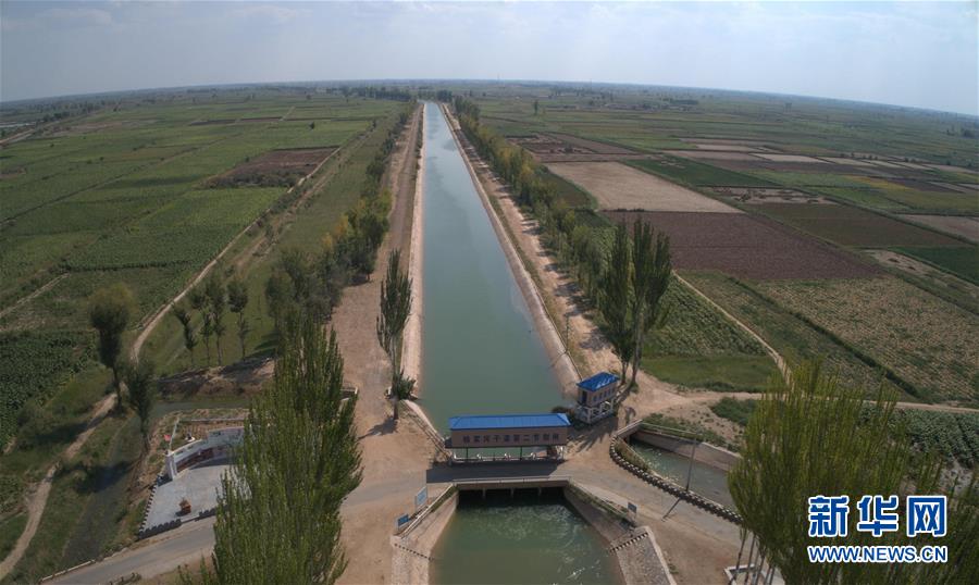 9月4日無人機(jī)拍攝的河套灌區(qū)楊家河干渠第二節(jié)制閘。 新華社記者 劉詩平 攝