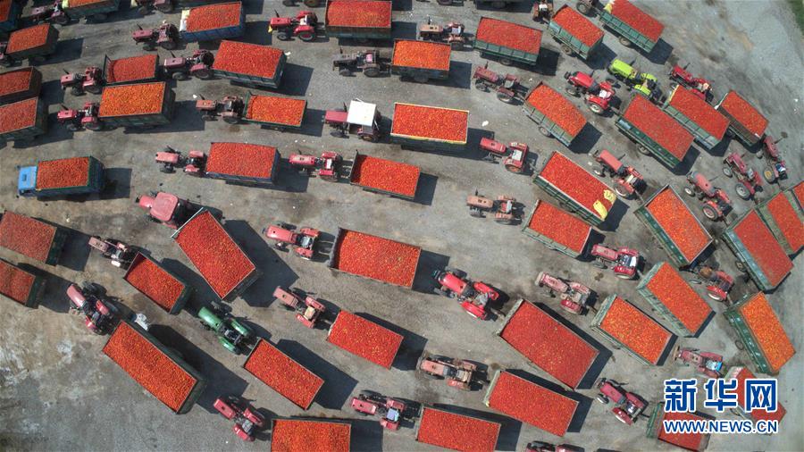 9月4日無人機(jī)拍攝的河套灌區(qū)三道橋鎮(zhèn)農(nóng)民向本地蔬菜加工廠排隊出售番茄。 新華社記者 劉詩平 攝