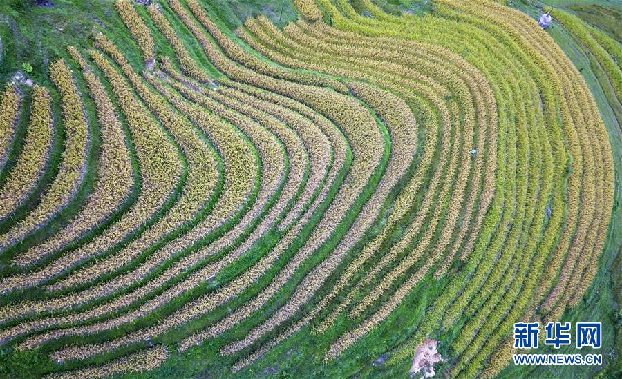 這是9月17日無人機拍攝的貴州省榕江縣計劃鄉(xiāng)計劃村陽開苗寨梯田。 近日,貴州省黔東南苗族侗族自治州榕江縣計劃鄉(xiāng)計劃村陽開苗寨的水稻陸續(xù)成熟,農(nóng)民們搶抓農(nóng)時收割稻谷。從空中俯瞰,層層疊疊的梯田線條分明,與古樸的苗寨木樓相互映襯,美不勝收。 新華社記者 楊文斌 攝