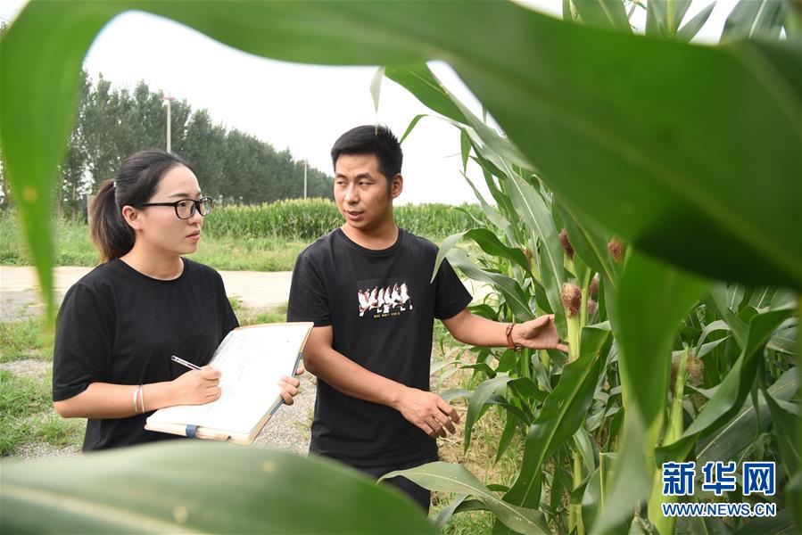 在山東省德州市平原縣的農場玉米地里,楊春雷(右)和卜璐璐查看玉米的長勢并監(jiān)測病蟲害狀況(8月22日攝)。 新華社記者 王凱 攝