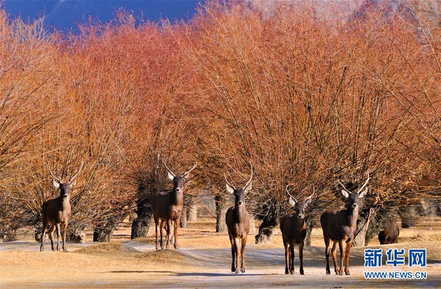 馬鹿棲息在位于雅魯藏布江岸邊的山南市乃東區(qū)澤當(dāng)鎮(zhèn)的萬畝人工防護(hù)林里(2018年1月6日攝)。新華社記者 張汝鋒 攝