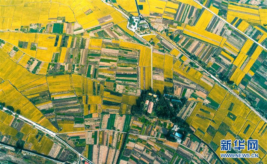 這是9月30日無人機拍攝的河北省涉縣白芟村的稻田。 近日,位于太行山下的河北省涉縣白芟村上千畝水稻逐漸成熟。從空中俯瞰,猶如一塊塊“調色盤”,美不勝收。 新華社記者 王曉 攝
