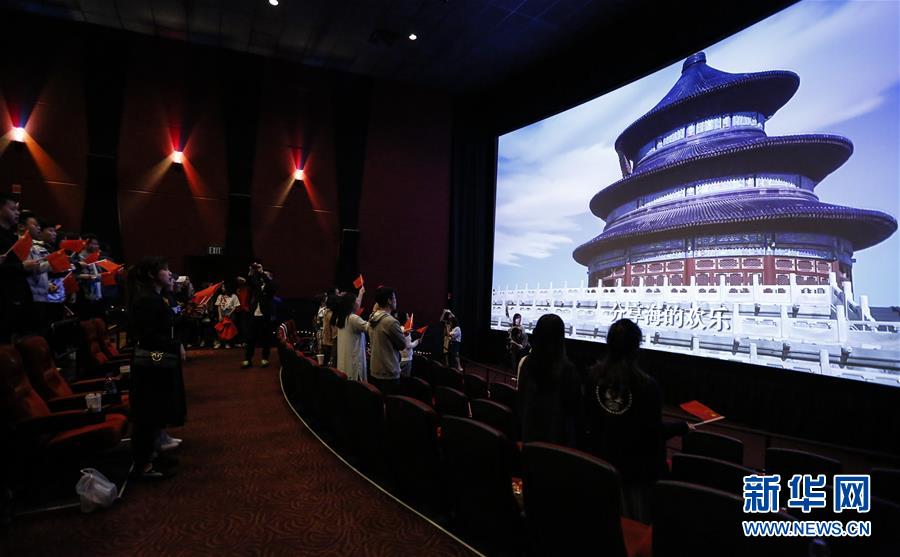 9月30日,在美國(guó)洛杉磯,觀眾在電影《我和我的祖國(guó)》當(dāng)?shù)厥子扯Y上合唱同名主題歌。新華社記者李穎攝