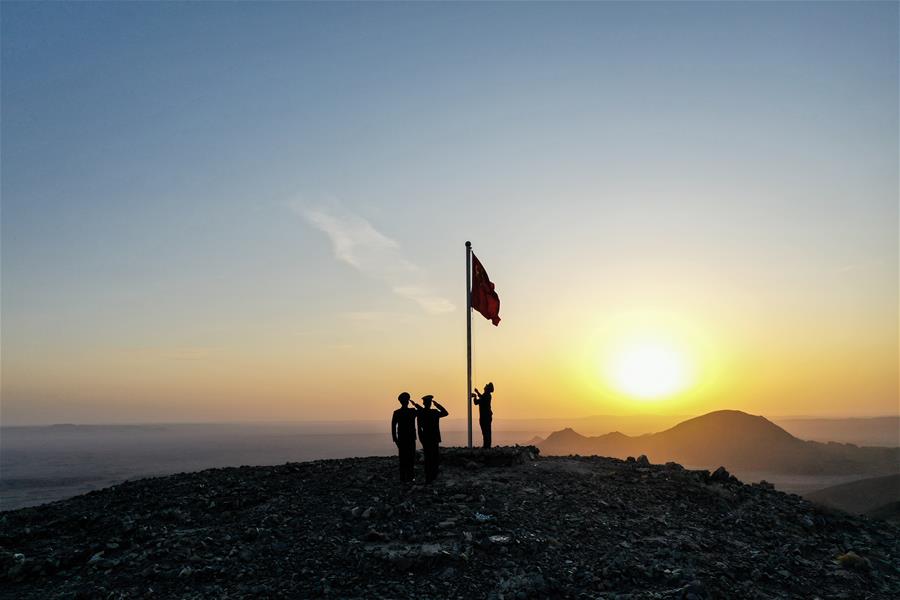 9月27日,內蒙古自治區(qū)額濟納旗算井子邊境派出所民警在大紅山上舉行升國旗儀式(無人機拍攝)。新華社記者劉磊攝