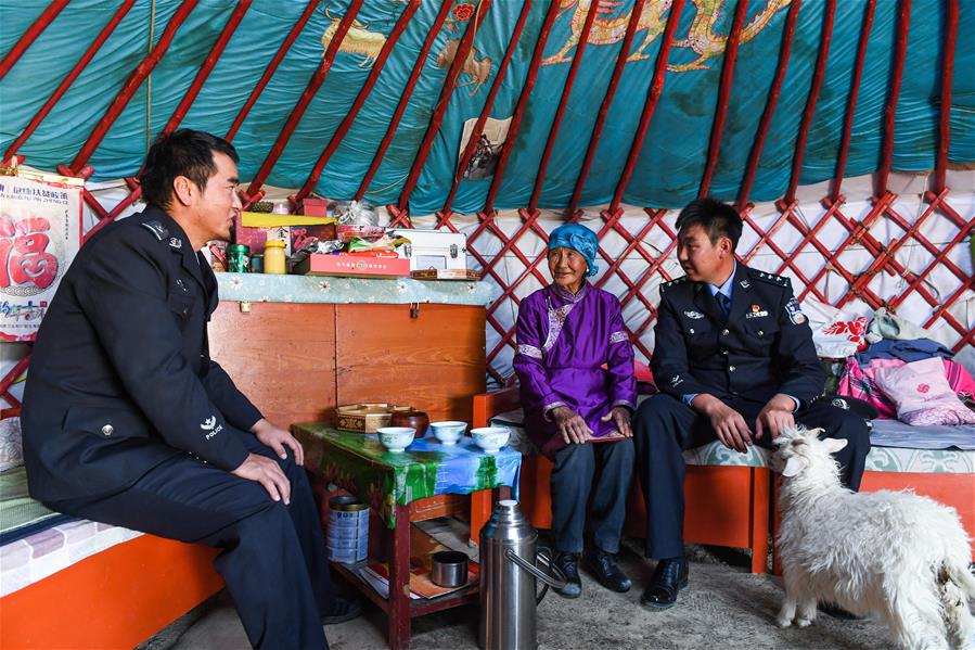 9月27日,內蒙古自治區(qū)額濟納旗算井子邊境派出所民警走訪看望牧民蘇伊勒圖雅(中)。新華社記者劉磊攝