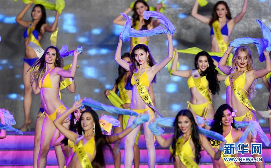 10月6日,中國(guó)選手譚若依(中)在泳裝環(huán)節(jié)比賽中亮相。新華社記者 李紫恒 攝