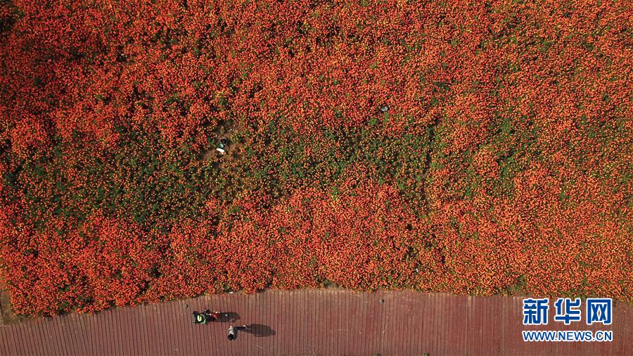 10月9日,游人在四季花海城市公園游覽(無人機(jī)拍攝)。 秋日時(shí)節(jié),位于安徽省合肥市的四季花海城市公園花香四溢,色彩繽紛,成為游客和市民休閑游玩的好去處。 新華社記者 張端 攝