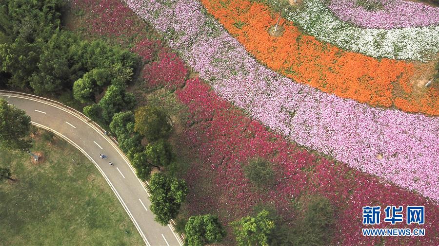 10月9日無人機(jī)拍攝的四季花海城市公園風(fēng)景。 秋日時(shí)節(jié),位于安徽省合肥市的四季花海城市公園花香四溢,色彩繽紛,成為游客和市民休閑游玩的好去處。 新華社記者 張端 攝