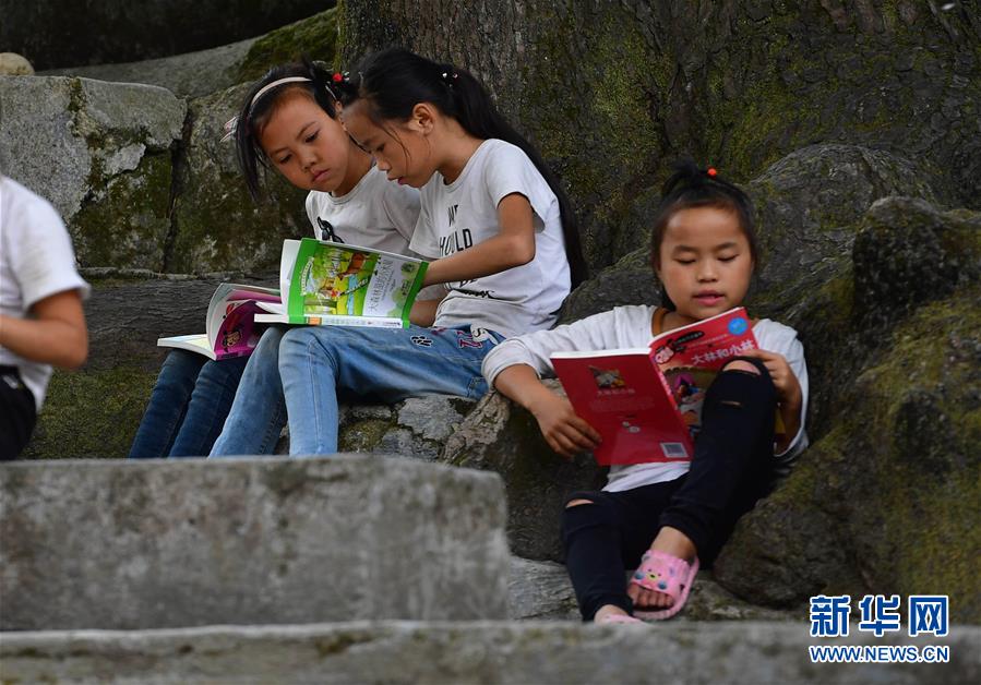 黔桂烏英苗寨的孩子們?cè)陂喿x剛剛獲贈(zèng)的圖書(10月11日攝)。