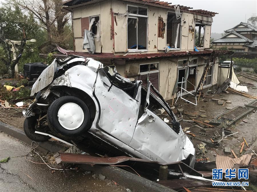 10月12日,在日本千葉縣市原市,建筑物和車輛遭龍卷風襲擊后被損毀。新華社記者 鄧敏 攝