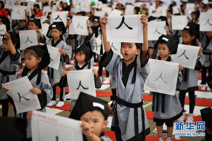 10月13日,參加儀式的小朋友在書寫“人”字。當(dāng)日,海口胡畫少兒藝術(shù)中心為500名小朋友舉行“開筆禮”,通過“點(diǎn)朱砂,啟智慧”“習(xí)書法,描人字”等儀式讓孩子們體驗中國傳統(tǒng)文化。新華社記者郭程攝