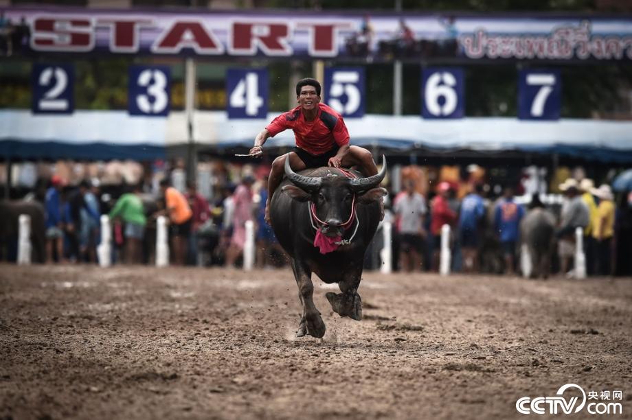當(dāng)?shù)貢r(shí)間2019年10月12日,泰國(guó)春武里舉行一年一度的水牛賽跑,選手騎牛狂奔。視覺(jué)中國(guó)