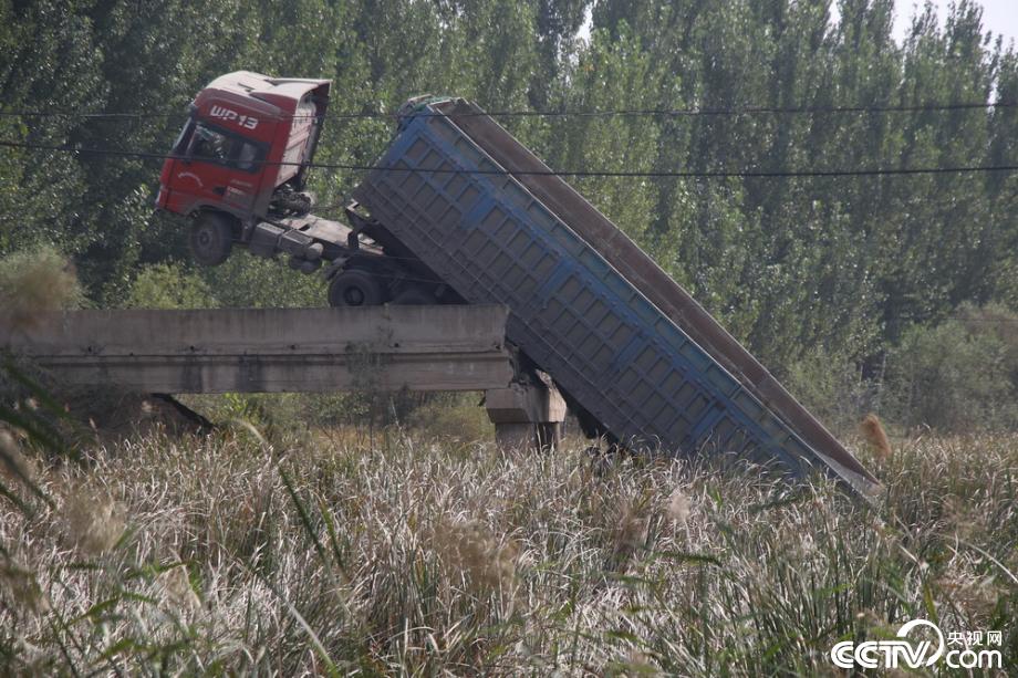 央視網(wǎng)消息:2019年10月13日,山東濱州,一輛滿(mǎn)載貨物的大貨車(chē)路過(guò)當(dāng)?shù)匾蛔鶎?米左右的小橋時(shí),致使橋面坍塌。據(jù)報(bào)道,13日凌晨4點(diǎn)左右,一輛重型半掛貨車(chē)沿渤海十八路由南向北行駛至市西辦事處李茂家村附近,右轉(zhuǎn)彎進(jìn)入連接渤海十八路與李茂家村村西鄉(xiāng)間路的一座寬4米左右的小橋時(shí),致使橋面坍塌?,F(xiàn)場(chǎng)貨車(chē)呈翹起之勢(shì),車(chē)頭懸于半空中,車(chē)尾插入水中,事故未造成人員傷亡。據(jù)現(xiàn)場(chǎng)了解,該橋建設(shè)于1974年,橋頭有警示標(biāo)識(shí),警示承載4噸。目前救援工作正在緊張有序地進(jìn)行中。視覺(jué)中國(guó)