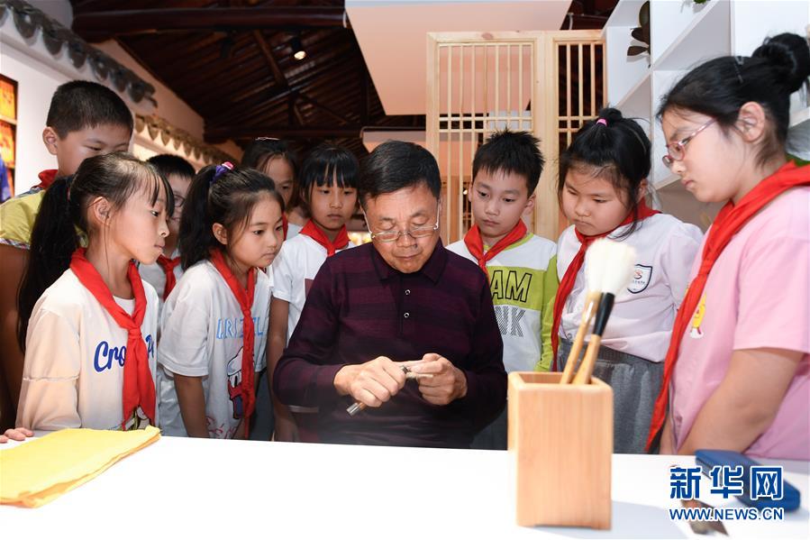 10月14日,湖筆制作技藝國家級代表性傳承人邱昌明(右四)在非遺活態(tài)傳承館展示湖筆制作的擇筆技能。 新華社記者 黃宗治 攝