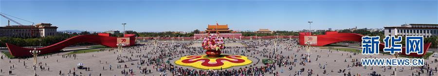 這是10月14日拍攝的天安門(mén)廣場(chǎng)中心花壇(全景拼接圖片)。 10月14日,以“花果籃”為主造型的天安門(mén)廣場(chǎng)中心花壇吸引了眾多游客參觀(guān)拍照?!盎ü@”的夜景更是流光溢彩,絢爛迷人。 新華社記者 殷剛 攝