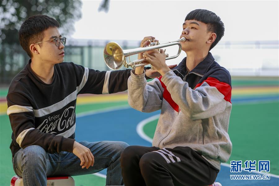 王太樊在教室外的樓道給自己心愛(ài)的小號(hào)試音(10月10日攝)。 新華社記者 劉潺 攝