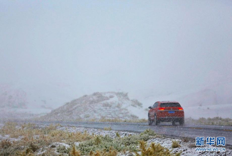 10月15日,在寧夏中衛(wèi)市沙坡頭景區(qū),汽車在大雪中行進(jìn)。新華網(wǎng)杜文杰攝