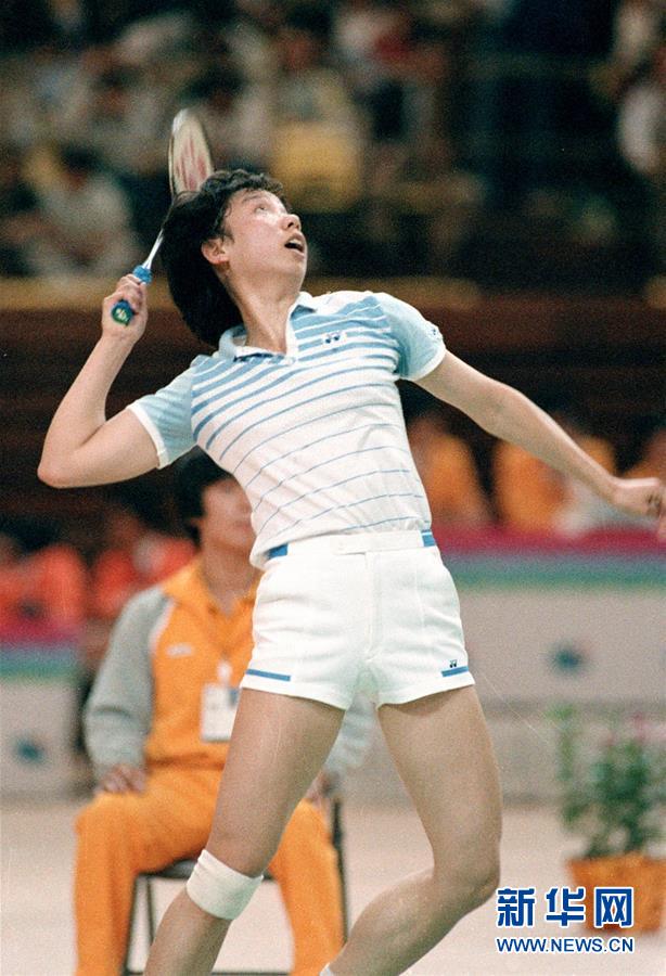 圖為韓愛萍在韓國漢城(首爾)舉行的第十屆亞洲運動會羽毛球女子單打比賽中擊球(資料照片),她最終奪得女單冠軍。新華社記者胡越攝