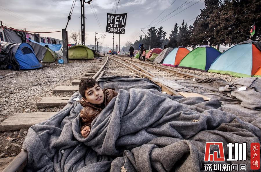 當?shù)貢r間2016年3月22日,希臘伊多梅尼,來自敘利亞阿勒頗的難民男孩躺在鐵軌上睡覺。