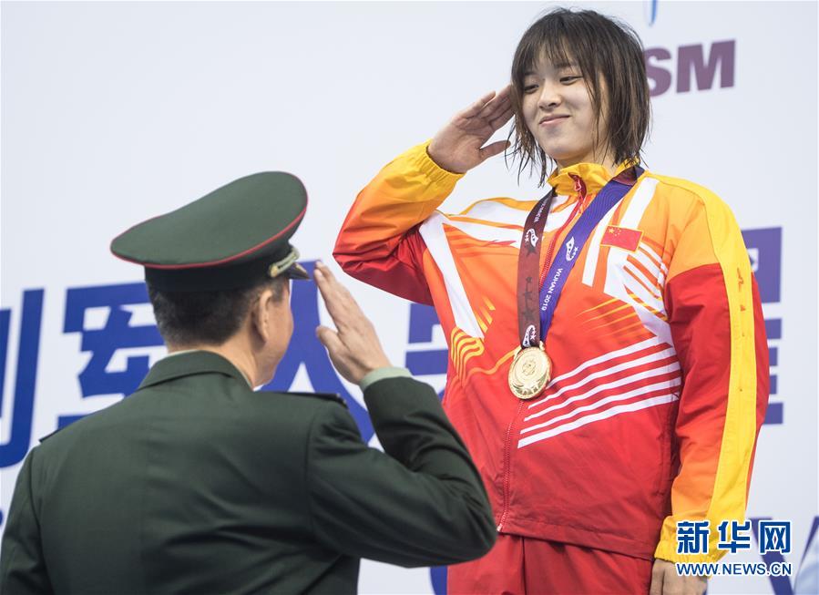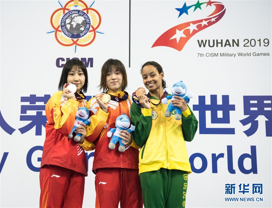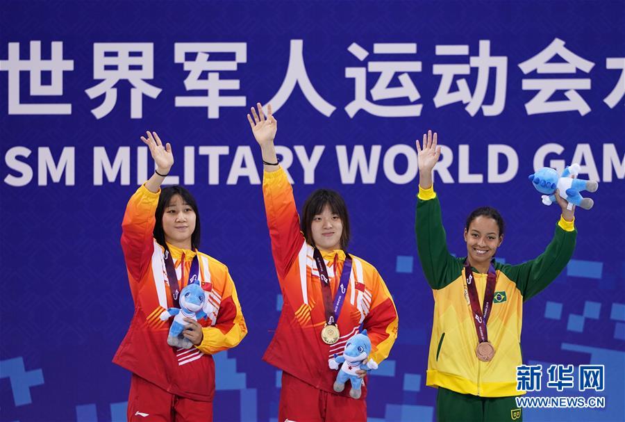 10月20日,中國隊(duì)選手吳慧敏(右)、包雪怡在升旗儀式上。當(dāng)日,在武漢舉行的第七屆世界軍人運(yùn)動會水上救生項(xiàng)目女子50米假人救生決賽中,中國隊(duì)選手吳慧敏以33秒93的成績奪得冠軍,隊(duì)友包雪怡以35秒79的成績獲得亞軍。新華社記者肖藝九攝