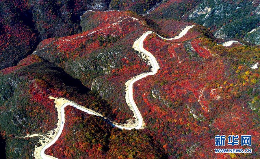 這是10月19日無人機(jī)拍攝的河北省涉縣太行紅葉大峽谷景色。新華社記者王曉攝