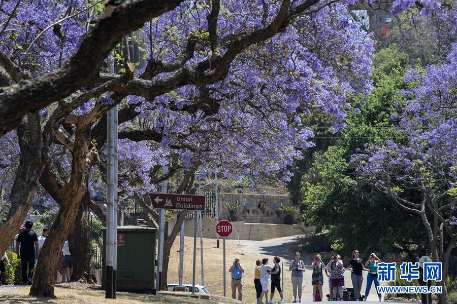 10月20日,在南非比勒陀利亞,游人在藍(lán)花楹樹下拍照。新華社記者陳誠攝