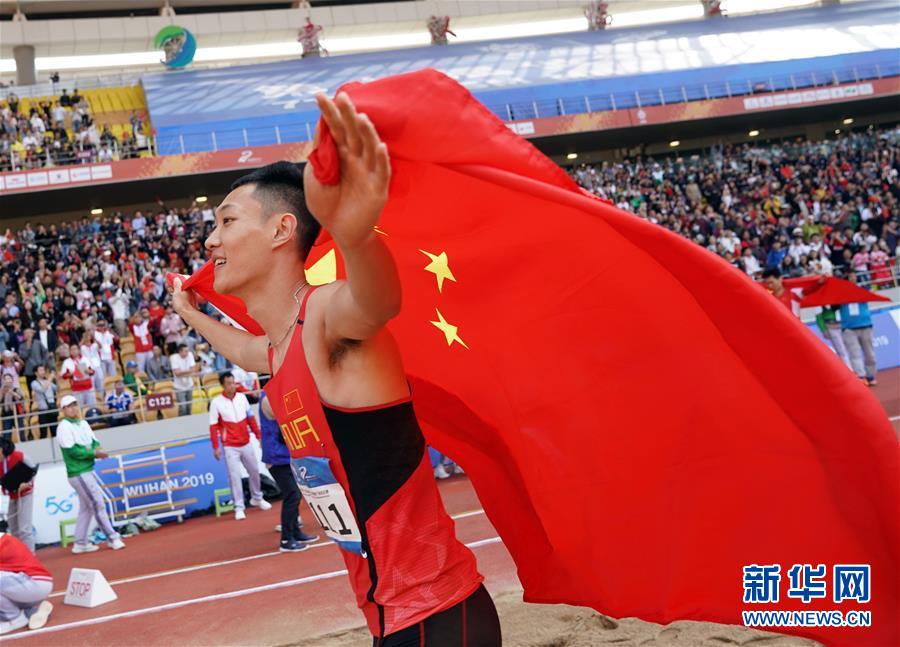 10月24日,中國(guó)選手王嘉男在比賽后慶祝。 當(dāng)日,在武漢舉行的第七屆世界軍人運(yùn)動(dòng)會(huì)田徑項(xiàng)目男子跳遠(yuǎn)決賽中,中國(guó)選手王嘉男、黃常洲分別以8米15和8米12的成績(jī)獲得冠亞軍。 新華社記者金良快攝